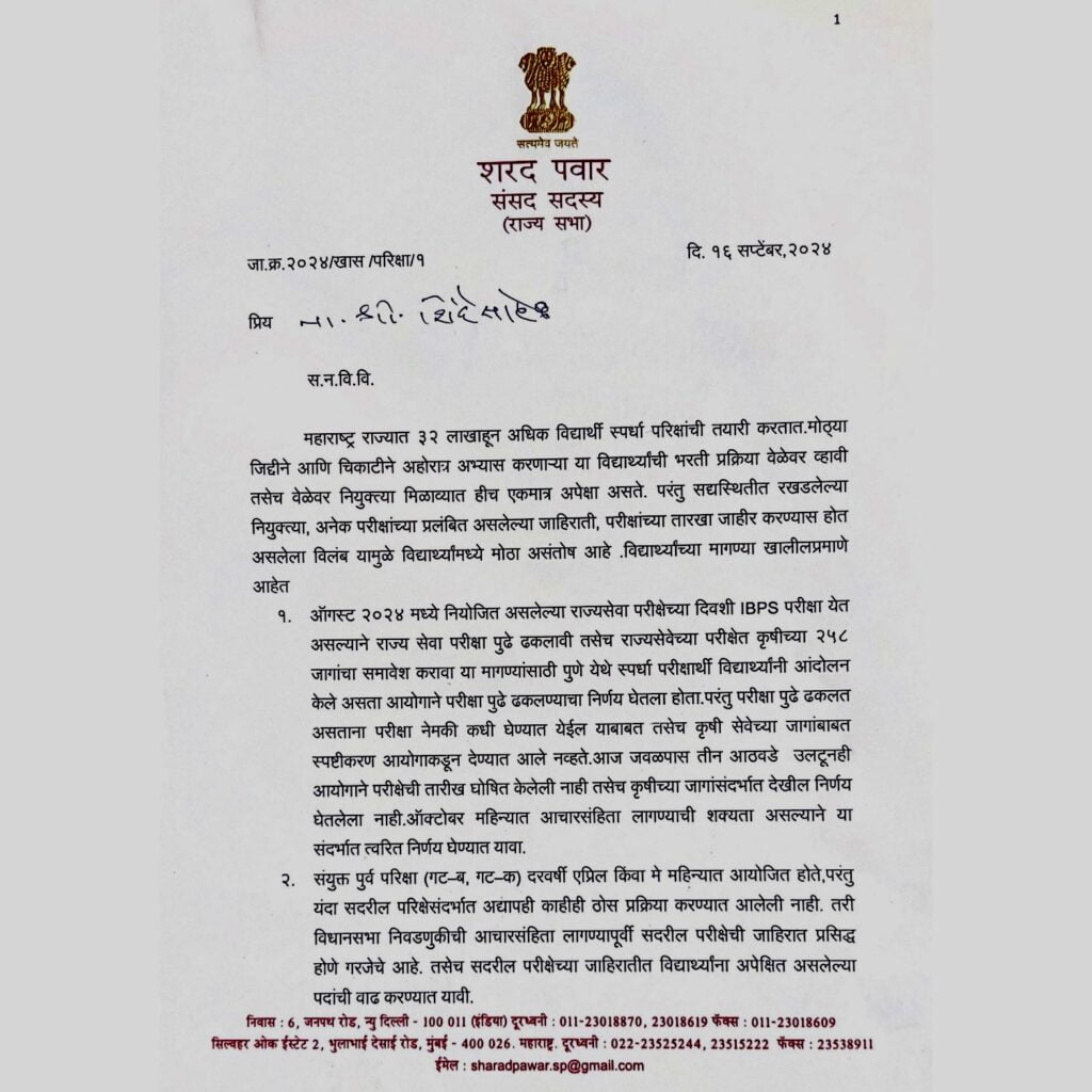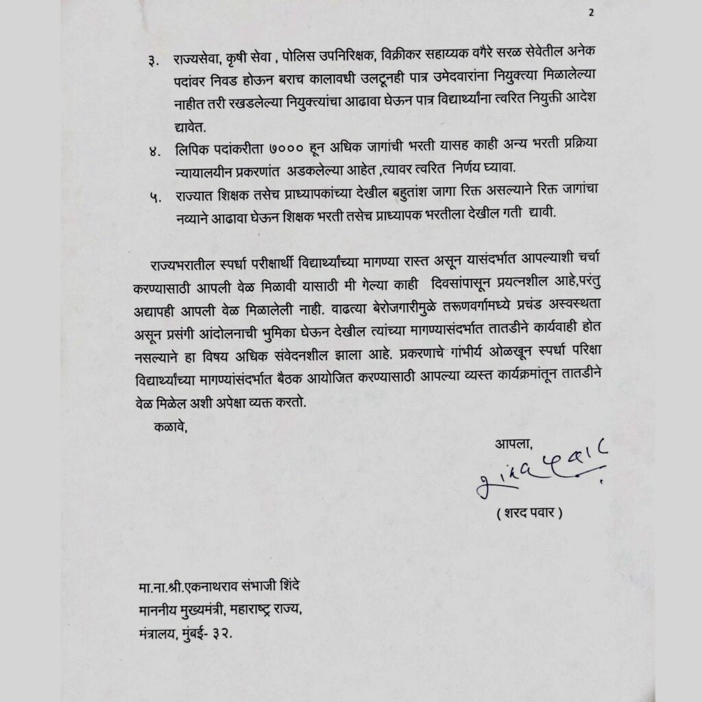 तसेच राज्य सेवा, कृषी सेवा, पोलीस उपनिरीक्षक, विक्रीकर सहाय्यक आदी परीक्षांच्या निकाल जाहीर झाला मात्र पात्र पदांवरील उमेदवारांना अद्याप देखील नियुक्त्या दिल्या गेल्या नाहीत. त्या त्वरित द्याव्यात.न्यायालयीन प्रक्रियेत अडकलेल्या विविध विभागातील जागांच्या प्रक्रिया मार्गी लावावी. राज्यातील शिक्षक आणि प्राध्यापकांच्या रिक्त जागा त्वरित भराव्यात अशा विविध मागण्यांचे पात्र खा. शरद पवार यांनी मुख्यमंत्री एकनाथ शिंदे याना लिहिले आहे. तसेच भेटीची वेळ मागितली आहे. यातून मार्ग काढण्यासाठी विविध विद्यार्थी संघटना आणि विद्यार्थ्यांनी काही दिवसांपूर्वी पवार याना साकडे घातले होते. यामुळे पवार यांनी हे पात्र लिहिले आहे.