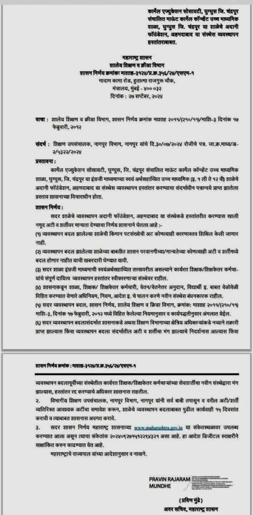 चंद्रपूरमधील एका कॉन्व्हेंट शाळेचे व्यवस्थापन अहमदाबादच्या अदानी फाउंडेशनकडे (adani foundation) देण्याचा निर्णय राज्याच्या शालेय शिक्षण विभागाने घेतला आहे. चंद्रपूरमधील माउंट कार्मेल या कॉन्व्हेंट शाळेचे व्यवस्थापन गुजरातच्या अदानी फाउंडेशनकडे देण्यात आले आहे. शासनाच्या शालेय शिक्षण विभागाने याबाबतचा शासन आदेश काढला आहे. चंद्रपूरच्या शाळेचा हाच पॅटर्न महाराष्ट्रातील इतर शाळांमध्ये सुद्धा राबवला जाणार का अशी चर्चा सुरू झाली आहे. ही कॉन्व्हेंट शाळा विनाअनुदानित असून याचे संपूर्ण व्यवस्थापन आता अदानी फाउंडेशन पाहणार आहे. त्यामुळे राज्यात उलटसुलट चर्चा सुरु झाल्या आहेत. राज्याचे विरोधीपक्षनेते विजय वडेट्टीवार यांनी मात्र या निर्णयामुळे सरकारवर टीका केली असून आता पाहापुरूषांसोबत अदानी यांचा फोटो लावायचेच राहिले आहे असे म्हटले आहे.